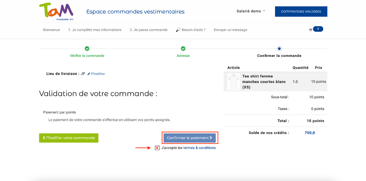 Vous trouverez le récapitulatif de vos informations personnelles (lieu de livraison, points).