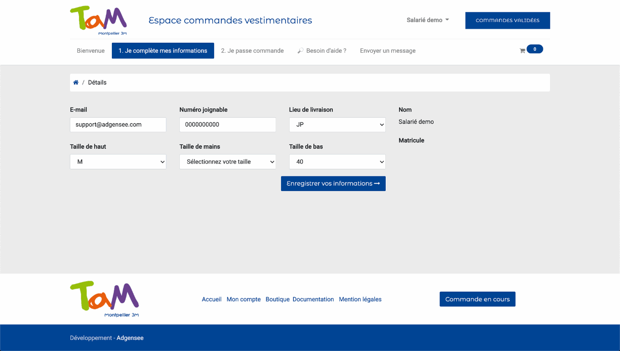 Renseignez toutes vos informations nécessaires aux commandes : lieu de livraison et tailles